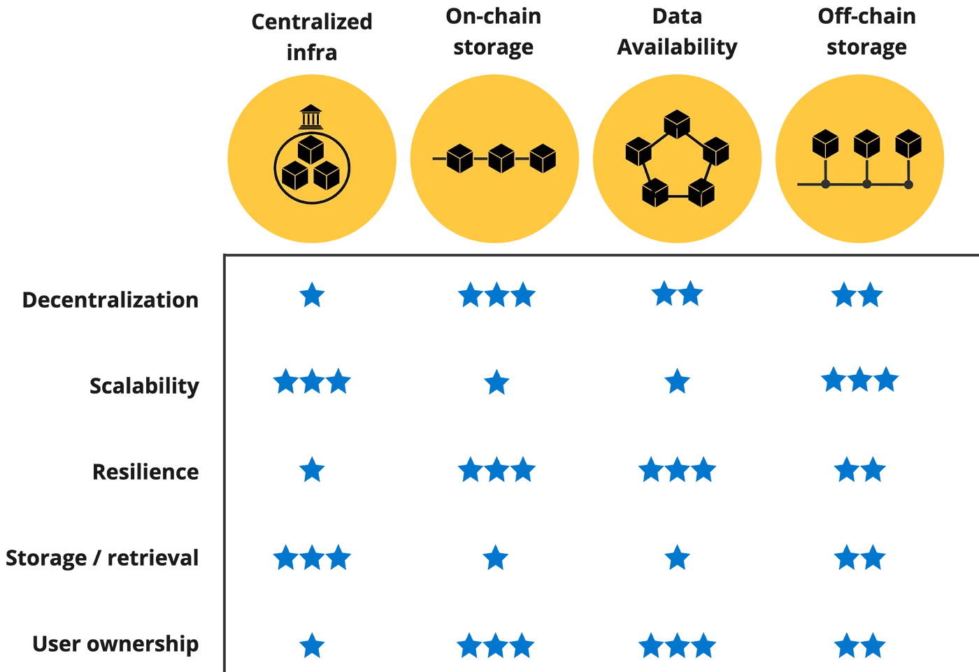 • Centralized storage: Store in a centralized, managed storage environment typically to ensure SLAs at the tradeoff of reduced decentralization