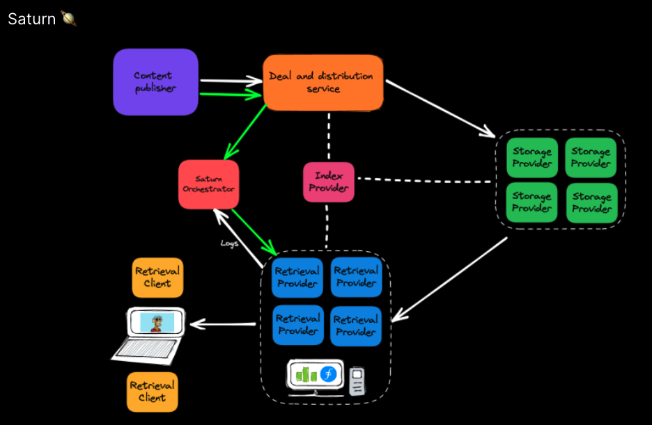 In H1 2022, Protocol Labs began work on the Saturn network. This network has two levels of RPs, L1 caches and L2 caches. The L1 cache node is the retrieval client’s entry point to the Saturn retrieval network. It uses Nginx under the hood. The L2 cache nodes sit as the next cache layer behind the L1s. L2s are designed to run on home computers in home networks, lowering the hardware requirements to join the wider Filecoin network. L2 is built with libp2p, and written in Golang.