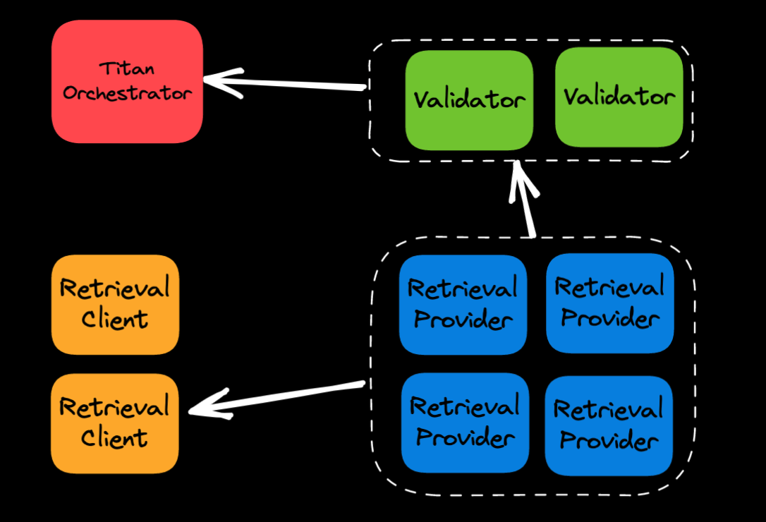 New Web Group is working on a retrieval network called Titan Ultra. The team has opted for a different approach from Saturn for proving contributions in the network. In the Titan network, there are validator nodes who perform retrieval tests against the RPs and report these tests back to an (initially) centralised orchestrator.