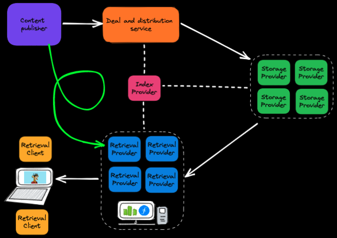 Starting at the top left, the Content Publisher (a.k.a Storage Client) speaks to deal services such as Estuary, NFT Storage and Filmine in order to store data. These services make deals with the Storage Providers (SPs), who in turn add the CIDs to the Indexer nodes. This flow is fully operational.
